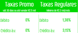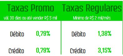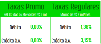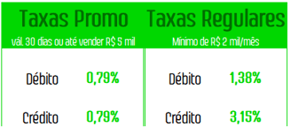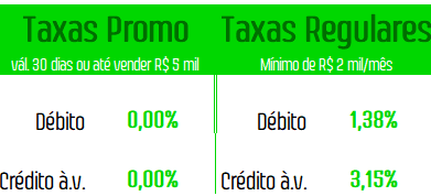 *Válidas por 30 dias ou até atingir R$ 5 mil em vendas (depois serão aplicáveis as Taxas Regulares / Padrão)